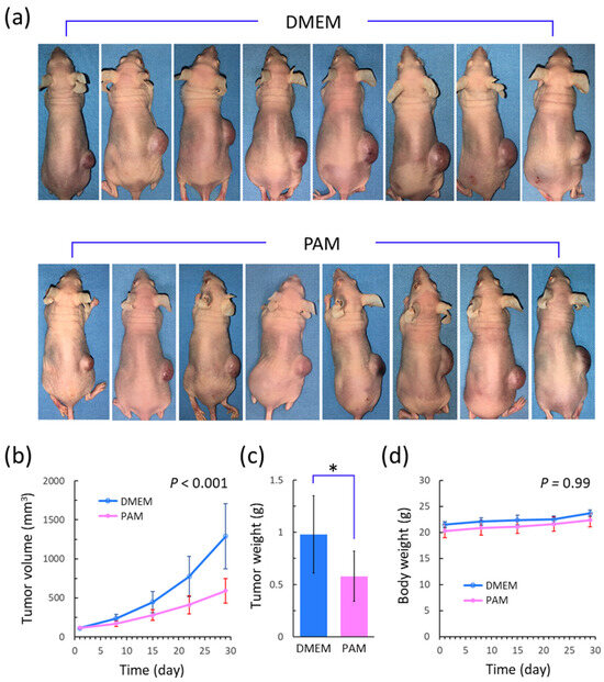 Figure 6a shows the images of each mouse on day 29 in the DMEM and PAM groups, and Figure 6b shows the tumor volume throughout the treatment period. PAM significantly suppressed tumor growth compared with DMEM (p < 0.001). Finally, on day 29, PAM suppressed the tumor volume to approximately 46% of that in the DMEM group. Figure 6c shows the final tumor weights in both groups. PAM significantly reduced the final tumor weight to approximately 59% of that in the DMEM group (p = 0.031). Figure 6d shows the mouse body weights throughout the treatment period, which does not show a significant body weight loss in the PAM group (p = 0.99). In addition, mice in the PAM group did not show any visible side effects, such as diarrhea, anorexia, or abnormal action. In summary, PAM significantly suppressed synovial sarcoma in vivo without any apparent side effects.