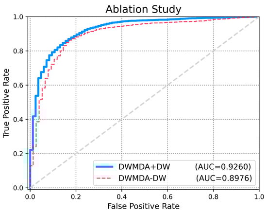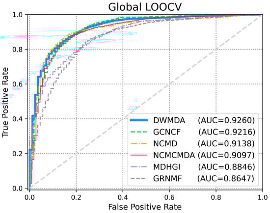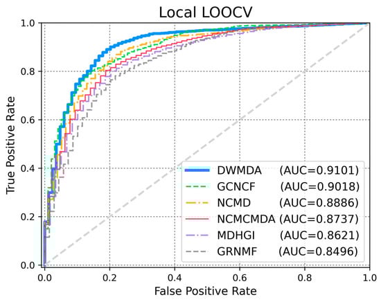 To evaluate the performance of DWMDA, we conducted a comparative experiment with several state-of-the-art models, including NCMD [17], GCNCF [40], NCMCMDA [36], MDHGI [35], and GRNMF [30]. These models were selected as benchmark methods because they represent significant advancements in the field and are widely recognized for their effectiveness in predictive tasks. By comparing DWMDA with these models, we aimed to assess its relative performance while ensuring that the comparison was based on similar techniques and approaches, thus providing a robust evaluation of DWMDA’s effectiveness in disease prediction tasks. Based on the global LOOCV (Figure 3), DWMDA achieved a meaningful AUC score of 0.9260, which was superior to those of GCNCF (0.9216), NCMD (0.9138), NCMCMDA (0.9097), MDHGI (0.8846), and GRNMF (0.8647), demonstrating its strong generalization ability across various diseases. We used local LOOCV to demonstrate the performance of DWMDA in identifying novel disease-related miRNAs, which is essential for advancing disease-specific biomarker discovery. As shown in Figure 4, DWMDA obtained an AUC score of 0.9101, indicating that it performed better than GCNCF (0.9018), NCMD (0.8886), NCMCMDA (0.8737), MDHGI (0.8621), and GRNMF (0.8496). This result reinforces the model potential to enhance the understanding of disease mechanisms at the molecular level. Moreover, the model performance was evaluated quantitatively using AUPRC, accuracy (ACC), and the Matthews correlation coefficient (MCC), which offer a more holistic view of its performance. As summarized in Table 1 and Table 2, we demonstrated that DWMDA consistently outperformed the other methods, providing compelling evidence of its superiority based on a wide range of evaluation metrics [40].