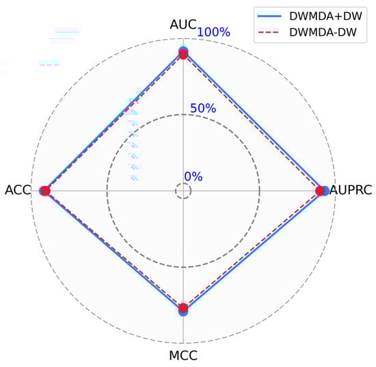 Ablation studies are an essential method for evaluating the role of individual components in a machine learning model. By selectively removing or altering specific parts of the model and measuring the resulting performance changes, researchers can determine the relative importance and functionality of each component. This systematic approach not only enhances our understanding of the model’s internal mechanisms but also helps identify critical elements that contribute to its success. Performing ablation studies is a valuable step in optimizing model design, improving efficiency, and ensuring robust interpretability. A key component of our proposed method is the use of DeepWalk to extract low-dimensional representations of diseases and miRNAs from the graph structure. To evaluate the significance of this component, we conducted a comparative analysis of our model with (DWMDA + DW) and without (DWMDA − DW) the integration of the DeepWalk module. The results demonstrate the critical role of DeepWalk in enhancing model performance, underscoring its contribution to capturing meaningful relationships within the graph. As a result, we confirmed that the use of DeepWalk led to improved performance in terms of various statistical metrics, highlighting its effectiveness in enhancing the predictive capability of our model (Figure 5 and Figure 6). This ablation study validates the effectiveness of incorporating DeepWalk in our approach and highlights its importance in achieving accurate predictions (Table 3).