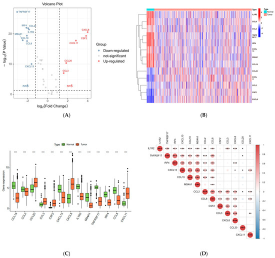 (A) Volcano plot of 13 differently expressed genes; (B) heatmap of 13 differently expressed genes; (C) boxplot of 13 differently expressed genes; (D) correlation dot plot of 13 differently expressed genes. (“*”: p < 0.05, “**”: p < 0.01, “***”: p < 0.001).