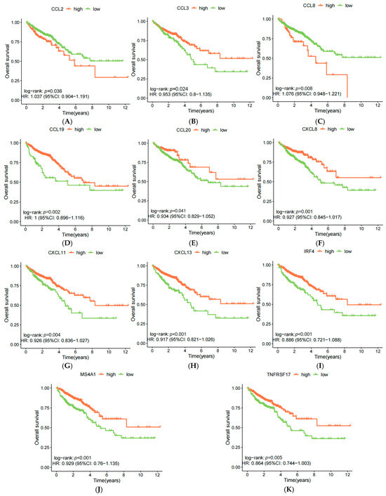 (A) CCL2-OS curves; (B) CCL3-OS curves; (C) CCL8-OS curves; (D) CCL19-OS curves; (E) CCL20-OS curves; (F) CXCL8-OS curves; (G) CXCL11-OS curves; (H) CXCL13-OS curves; (I) IRF4-OS curves; (J) MS4A1-OS curves; (K) TNFRSF17-OS curves.