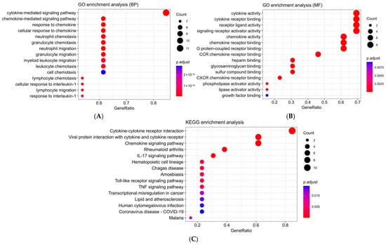 To elaborate on the biological roles of the 11 genes TLS-related genes, GO and KEGG pathway analyses were performed. The genes were significantly enriched in biological processes such as cytokine-mediated signaling pathway, chemokine-mediated signaling pathway, response to chemokine, cellular response to chemokine, and neutrophil chemotaxis. Molecular functions included chemokine activity, chemokine receptor binding, cytokine activity, cytokine receptor binding, chemokine receptor binding, G protein-coupled receptor binding, and receptor ligand activity (Figure 4A,B). KEGG analysis revealed involvement in pathways such as cytokine–cytokine receptor interaction, viral protein interaction with cytokine and cytokine receptor, chemokine signaling pathway, rheumatoid arthritis, IL-17 signaling pathway, and hematopoietic cell lineage (Figure 4C). These findings suggested that TLS-related genes play a role in modulating immune response.