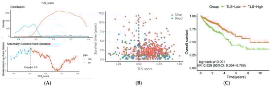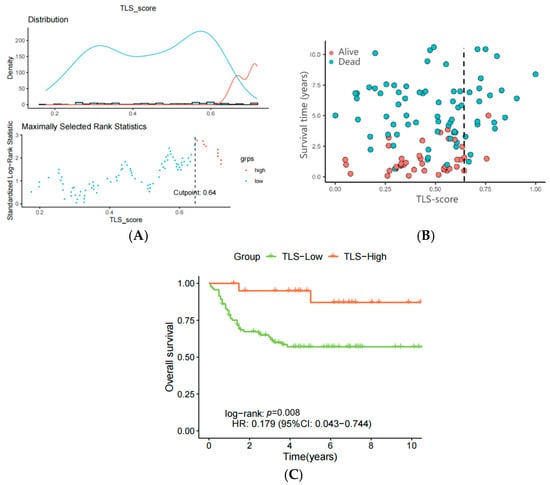 (A) Cutpoint for TLS in TCGA samples calculated by ssGSEA enrichment analysis, TLS-high in orange, TLS-low in sky blue; (B) scatter plot of survival time for TLS-high and TLS-low groups; (C) K-M curve of survival status for TLS-high and TLS-low groups.