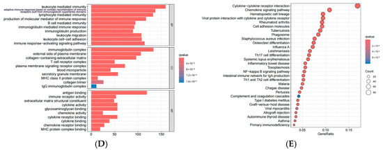 Differential gene expression analysis was performed on TCGA samples based on ssGSEA scores. Heatmap and volcano plot of top 50 differentially genes (out of 1208 genes) are shown in Figure 7A,B. GO and KEGG analyses revealed that these genes were enriched in biological processes such as leukocyte-mediated immunity, adaptive immune response based on somatic recombination of immune receptors built from immunoglobulin superfamily domains, and lymphocyte-mediated immunity. Cellular components included immunoglobulin complex, external side of plasma membrane, collagen-containing extracellular matrix, and plasma membrane-signaling receptor complex, while molecular functions involved antigen binding, cytokine activity, glycosaminoglycan binding, and cytokine receptor binding. KEGG pathway analysis included cytokine–cytokine receptor interaction, chemokine signaling pathway, cell adhesion molecules, and hematopoietic cell lineage. These results suggest that TLS-related gene expression levels influence immune response regulation, consistent with earlier findings (Figure 7).