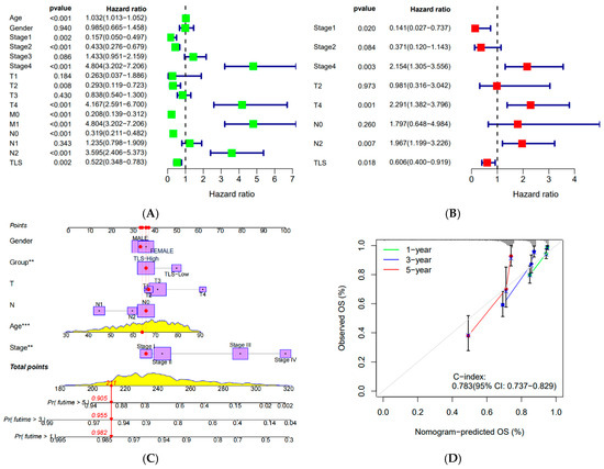 (A) Univariate cox prognostic analysis of clinical characteristics and TLS scores; (B) univariate and multifactorial cox prognostic analysis of clinical characteristics and TLS scores; (C) nomogram of clinical characteristics and TLS score; (D) calibration curves of clinical characteristics and TLS score. (“**”: p < 0.01, “***”: p < 0.001).