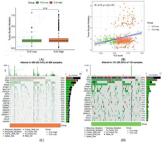 Tumor mutational burden (TMB) was compared between TLS-high and TLS-low groups. Although TLS-high patients exhibited slightly higher TMB, the difference was not statistically significant (p = 0.19) (Figure 10A). A weak positive correlation was observed between TMB and TLS scores (r = 0.17, p < 0.001) (Figure 10B). The 20 most frequently mutated genes were visualized to compare genetic alterations between the two groups (Figure 10C,D).