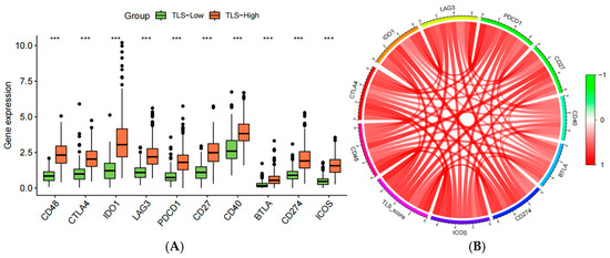(A) Association of high and low TLS scores with 10 immune checkpoint-associated genes; (B) chord diagram of the association of high and low TLS scores with 10 immune checkpoint-associated genes. (“***”: p < 0.001).