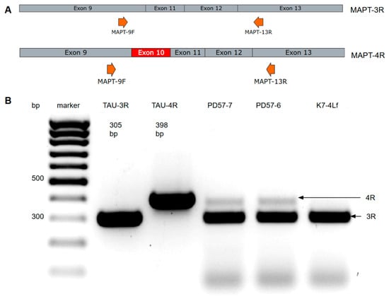 The MAPT:c.2013T > G genetic variant is a 4R tauopathy, suggesting increased expression of the 4R form of the protein. To evaluate the expression of the MAPT mRNA forms with or without exon 10 (producing the 4R and 3R forms of tau protein, respectively) in the dopaminergic neurons derived from iPSC lines PD57-7 (ICGi052-B), PD57-6 (ICGi052-A), K7-4Lf (ICGi022-A) [25,26], we performed qualitative PCR with cDNA using MAPT-9F and MAPT-13R primers (Figure 1A).