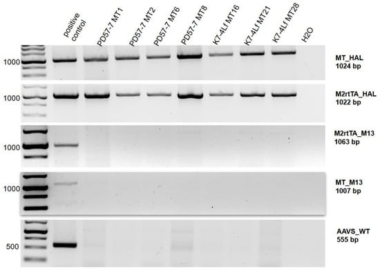 PCR analysis to verify the successful integration of the MitoTimer biosensor and doxycycline-dependent transactivator transgenes into the AAVS1 locus. MT_HAL: screening for integration of the MitoTimer biosensor transgene into the AAVS1 locus, M2rtTA_HAL: screening for integration of the M2rtTA transgene into the AAVS1 locus, MT_M13: screening for off-target insertion of the MitoTimer donor plasmid into the genome, M2rtTA_M13: screening for off-target insertion of the AAVS1-NEO-M2rtTA donor plasmid into the genome, AAVS_wt: screening against the wild-type AAVS1 locus.