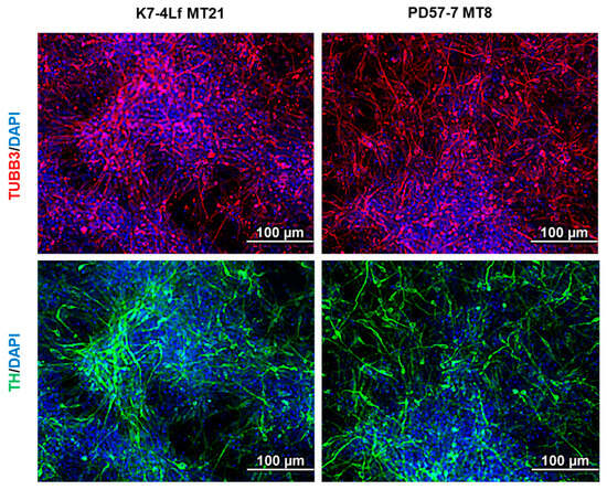 To validate the MitoTimer readout in the relevant cell type, transgenic iPSC clones were differentiated into dopaminergic neurons. All differentiated cell cultures showed the presence of TUBB3, the major neuronal marker, as well as the marker of mature dopaminergic neurons—tyrosine hydroxylase/TH—at days 60–75 of neuronal differentiation (Figure 4).