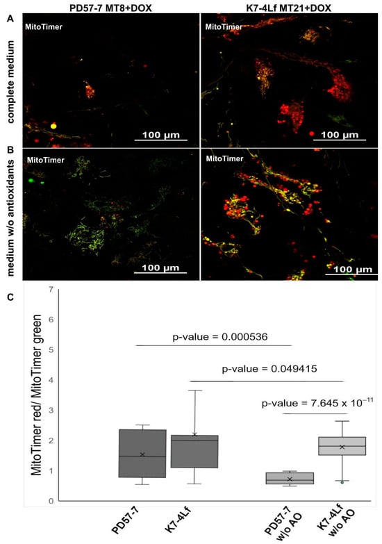 The MitoTimer readout was calculated in neuronal cells growing in both full medium and an antioxidant-depleted medium (Figure 5C). The red/green ratio in K7-4Lf-MT and PD57-MT neurons that were cultured on complete medium in the presence of doxycycline was comparable. However, in an antioxidant-depleted medium, significant differences are observed between the patient’s cells and the control. The average value of the ratio significantly decreased when neurons were cultured in the absence of antioxidants (from 1.49 to 0.72 in the patient’s cells and from 2.17 to 1.78 in the control).
