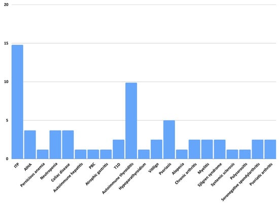 In our series, 40/81 patients (49%) developed at least one autoimmune disease. They were 32 females (80%), with a mean ± SD age at CVID diagnosis of 44 ± 16 years old. Their main characteristics are reported in Table 2. The autoimmune diseases presented in our series were heterogeneous and involved different organ systems, as shown in Figure 1 and Figure 2. Cytopenias were the most common and were present in 19 patients (16 females, 84%) and were mainly represented by ITP (n = 12). Eleven patients had an endocrine autoimmune disease with predominant autoimmune thyroiditis (n = 8; 6 females, 75%) (Figure 1).