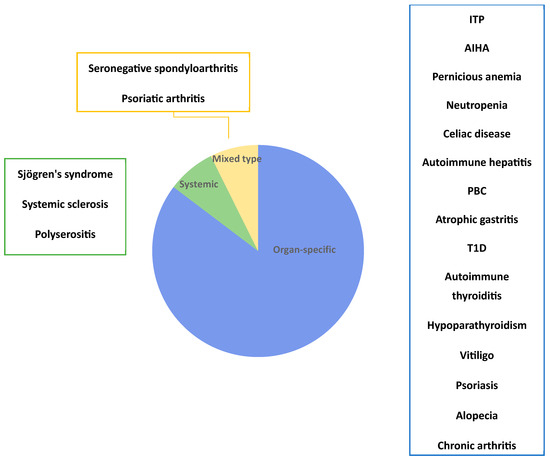 Prevalence of organ-specific, systemic, or mixed type autoimmune diseases in our cohort of 81 CVID patients. Abbreviations: AIHA: autoimmune hemolytic anemia, ITP: immune thrombocytopenia, PBC: primary biliary cholangitis, T1D: type 1 diabetes.
