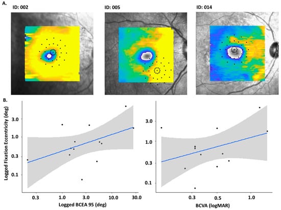 (A). Examples of eccentric fixation evident in the cohort when microperimetry grid data were overlayed on top of SD-OCT facing imaging. (B). Relation between eccentric fixation and BCEA 95% and BCVA in a cohort with CRB1 Note: Participant 009 excluded due to epiretinal membrane presence.