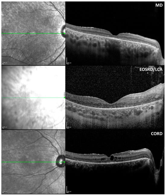 In 18 participants with CRB1-associated retinopathies, the lamination of the retina was categorised into three grades. Four participants exhibited grade 1 (normal) lamination, nine participants had grade 2 lamination (normal organisation with coarse lamination), and five participants had grade 3 lamination (disorganisation with coarse lamination). Specifically, among participants with CORD, two had grade 2 and one had grade 3 lamination. Among those with EOSRD/LCA, one participant had grade 1 and four had grade 3 lamination. Participants with MD included three with grade 1 lamination and seven with grade 2 lamination. Additionally, cystoid macular oedema (CMO) was present in five participants: three with MD, one with CORD, and one with EOSRD/LCA. See Table 3 for OCT patterns across the different phenotypes and Figure 3 for examples.