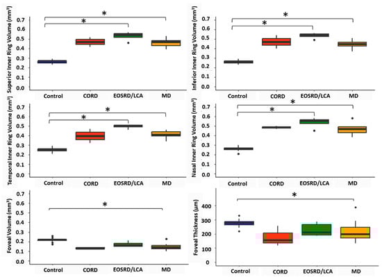 Following subgroup analysis, the mean inner ring volumes for MD, CORD, and EOSRD/LCA were 0.45 mm3 (SD ± 0.05 mm3), 0.46 mm3 (SD ± 0.07 mm3), and 0.52 mm3 (SD ± 0.04 mm3), respectively. For participants with MD, the superior, inferior, temporal, and nasal quadrants had a statistically significantly larger volume than normative data (all p < 0.001), while the foveal volume was significantly smaller (p < 0.05). For participants with EOSRD/LCA, the superior, inferior, temporal, and nasal quadrants had a statistically significantly larger volume than normative data (all p ≤ 0.01), while the foveal volume was not significantly smaller than the normative reference (p = 0.2). For the two participants with CORD, none of the quadrants nor the fovea were found to be significantly different from normative data.