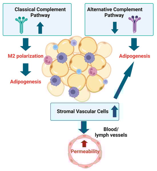 Lipedema adipose tissue has elevated stromal vascular cells, which can increase the permeability of vessels. In addition, stromal vascular cells were also shown to promote adipogenesis. Higher levels of the components of the classical complement pathway can induce M2 macrophage polarization, shown to enhance adipogenesis. Lower levels of the components of the alternative complement pathway may increase adipogenesis. Created in BioRender. (2025) https://BioRender.com/n48i771, accessed on 19 February 2025.