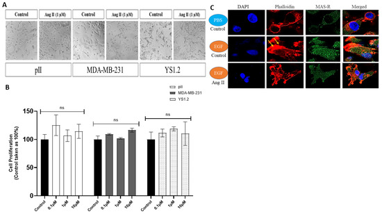 Effect of Ang II treatment on ER+ and ER− breast cancer cells. The effect of Ang II treatment (1 µM, 72 h) was determined on cell morphology (20× magnification, (panel (A))). The effect of Ang II treatment (96 h) on cell proliferation was determined in response to vehicle (control, solid bars) or various concentrations of Ang II. Histobars represent means ± SEM of at least 3 independent experiments (n = 9–21 for control groups, and n = 3–9 per various treatment groups, ns: not significant, (panel (B))). (Panel (C)) shows immunofluorescence analysis of pII cells in response to Ang II pre-treatment (10 µM for 24 h) and a concentration gradient of EGF (10 µg/mL) or PBS (used as negative control). Cells were stained with phalloidin (red, for actin cytoskeleton), MAS-R (green), and DAPI (blue, for the nucleus). Membrane ruffling was evident (yellow arrows) in response to a concentration gradient of EGF (63× magnification) (ns = not significant).
