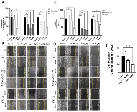 Effect of Ang 1–7 and AVE0991 treatment on breast cancer cell motility and invasion. The degree of cell motility in response to vehicle (control, solid bar) or treatment with Ang 1–7 or AVE 0991 (colored bars) was determined. (Panels (A,B), 20× magnification) represent cell motility in response to Ang 1–7 treatment. (Panels (C,D), 40× magnification) represent cell motility in response to AVE0991 treatment. Histobars represent means ± SEM of at least 3 independent determinations (n = 3 per group, ns: not significant). Asterisks denote the significant differences from control: * p ˂ 0.05, ** p ˂ 0.001, *** p ˂ 0.0001. (Panel (E)) shows pII cell invasion in response to Ang 1–7 and AVE0991 treatment. Cells were pre-treated with vehicle (control, solid bar), Ang 1–7, or AVE 0991 (10 µM, open bars). Histobars represent means ± SEM of at least 3 independent determinations (n = 3 per group). Asterisks denote the significant differences from control: * p ˂ 0.05, *** p ˂ 0.0001.
