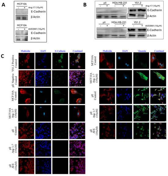 Western blot analysis was performed on the MCF10A, pII, MDA-MB-231, and YS 1.2 cells to determine the effect of Ang 1–7 or AVE0991 treatment on the expression profile of E-cadherin. It was previously evident that pII and MDA-MB-231 cells do not express E-cadherin, while YS 1.2 does [28]. Treatments of the different ER+ and ER− breast cancer cell lines and normal breast epithelial cells with Ang 1–7 or AVE0991 did not modulate the E-cadherin expression profile (Figure 7A,B). Next, immunofluorescence analysis was performed to confirm the western blot results of the E-cadherin expression levels, as well as to determine the expression profile of the mesenchymal marker vimentin. E-cadherin was only expressed in the YS 1.2 cells, but not in the MCF10A, pII, or MDA-MB-231 cells, confirming the western blotting data. Moreover, Ang 1–7 and AVE0991 treatments did not modulate the expression profiles of E-cadherin or vimentin (Figure 7C).