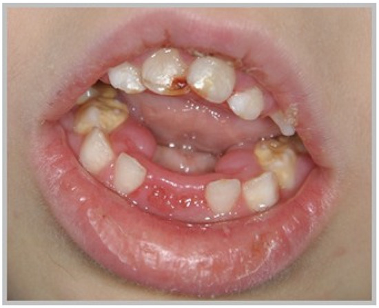 In mild forms, one observes, among other things, discrete features of facial dysmorphia, syndactyly of the second and third toes, eating disorders, moderate delays in psychomotor development, difficulties at school, and behavioral disorders. In classical and severe forms, a child with SLOS is born with numerous congenital defects and strongly marked features of facial dysmorphia. There are malformations of the heart, gastrointestinal tract, abnormalities of the external genitalia, microcephaly, decreased muscle tone, delayed psychomotor development, psychomotor hyperactivity, aggression, autistic features, and syndactyly of the second and third toes [1,5,8]. Some patients with SLOS show increased susceptibility to infections, including respiratory, ear, and urinary tract infections [5]. Delayed psychomotor development, dental abnormalities, and occlusal abnormalities, as well as impaired homeostasis of the oral environment, due to frequent vomiting, may increase the risk of dental caries and gingivitis in children with Smith–Lemli–Opitz syndrome [9,10,11]. Some symptoms of the syndrome can be alleviated with cholesterol and bile acid supplementation, and the use of statins, such as simvastatin, to lower 7-DHC levels. Oral health symptoms can be reduced with properly targeted preventive and dental treatment measures [10]. However, early recognition of the disease is important, and GPs, including dentists, should be involved in this process. It is essential to know the symptoms indicative of SLOS, as well as the oral health risks and causative factors of tooth decay and gingivitis in this group of patients.