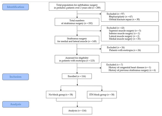Data from a total of 123 consecutive patients who underwent strabismus surgery for exotropia between July 2016 and December 2017 were screened for inclusion in the present study. Seven patients were excluded due to a history of congenital cardiac disease (n = 1) or a history of previous strabismus surgery (n = 6). Therefore, 116 patients were included in the final analysis (58 for the No-block group vs. 58 for the ITN block group) (Figure 1).