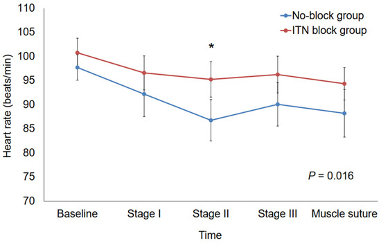 Intraoperative changes in heart rate. (* p = 0.008). ITN, infratrochlear nerve; Baseline, the time of hemodynamic stability after anesthesia induction and surgical preparation; stage I, conjunctiva incision during medial rectus resection; stage II, muscle dissection during medial rectus resection; stage III, muscle traction during medial rectus resection; muscle suture, the point at which medial rectus resection was finalized.