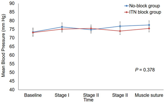The changes in HR during strabismus surgery were significantly greater in the ITN block group than in the No-block (p = 0.016) (Figure 2). In particular, HR at stage II of MR was significantly higher in the ITN block group than in the No-block group (p = 0.008) (Figure 2). On the other hand, MBP during strabismus surgery was not significantly different between the two groups (p = 0.378) (Figure 3).
