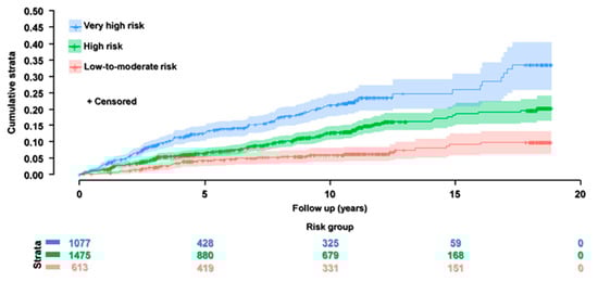 Kaplan–Meier curves for cumulative incidence stratified by SCORE2/SCORE2-OP class. Product limit Survival Estimates with the number of subjects at risk and 95% Hall–Wellner Bands. Logrank p < 0.0001.