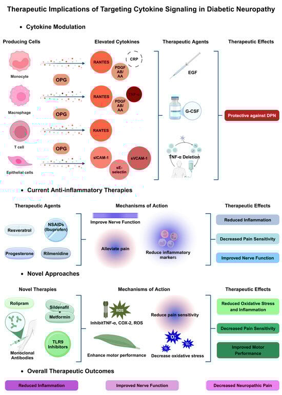 Therapeutic implications of targeting cytokine signaling in diabetic neuropathy. Current therapies and novel approaches aim to modulate cytokines (TNF-α, RANTES, sVCAM-1) and reduce oxidative stress to alleviate neuropathic pain, improve nerve function, and reduce inflammation.