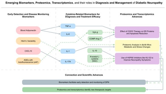 Emerging biomarkers and therapeutic advances in diabetic neuropathy. Early detection biomarkers (adiponectin, CXCL10, AGEs) and cytokine-related markers (IL-6, TNF-α, IL-10) facilitate disease monitoring. Proteomics and transcriptomics uncover novel therapeutic targets such as CQYG therapy and HSP90 inhibitors, paving the way for precision medicine approaches.