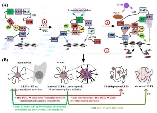 BET proteins have several intrinsically disordered regions (IDRs): NPS, BID, and CPS, which are present in all family members, and the long C-terminal IDR, which is characteristic of BRD4L []. IDRs are important drivers of liquid–liquid phase separation (LLPS) []. This process underlies the formation of intracellular biomolecular condensates (membraneless organelles) such as nucleoli, transcription/replication foci, reparation condensates or condensates at super-enhancers (SEs), and, to a lesser extent, at common enhancers and promoters [,,]. BRD4 plays a prominent role at SEs, where it facilitates the accumulation and separation of the mediator complex and, together with Med1, scaffolds the condensates through its C-terminal IDR [,] (Figure 2A). The term “super-enhancer” was proposed in 2013 [] and refers to a cluster of enhancers in close genomic proximity that cooperatively assemble a high density of the transcriptional apparatus []. In normal cells, SEs regulate the expression of genes that specify cell identity and functionally conform to cell type-specific biological processes. In cancer cells, key oncogenes are also regulated by SEs and BRD4-driven aberrant SE activation may trigger oncogenesis [,] (Figure 2B).