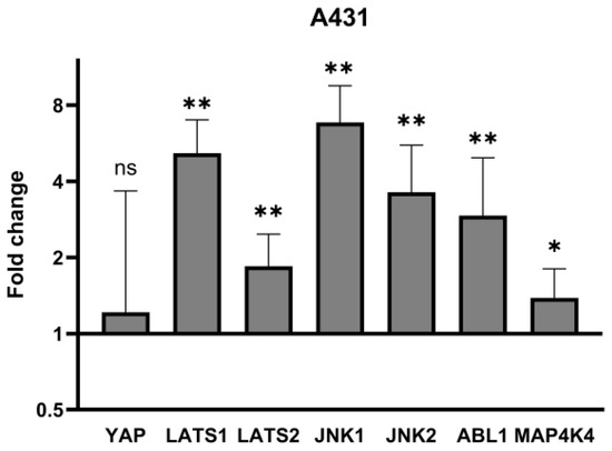 mRNA expression of YAP and its regulators in A431 cell line. Data presented as fold change (columns) with geometric standard deviations (bars). Asterisks above columns indicate level of statistical significance (ns—not significant, * p < 0.05, ** p < 0.001) in comparison to controls.