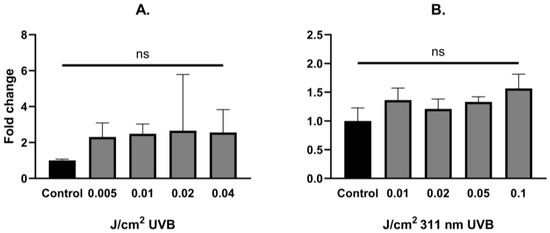 YAP fold change alterations in primary epidermal keratinocytes after exposure to different doses of UVB (A) and 311 nm UVB (B). Data presented as fold change (columns) with geometric standard deviations (bars) (ns—not significant).