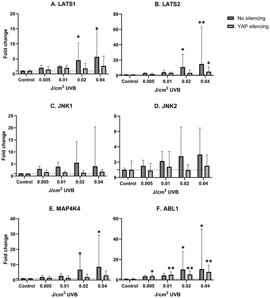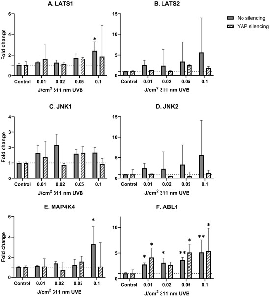 mRNA expression of studied Hippo pathway regulators: LATS1 (A), LATS2 (B), JNK1 (C), JNK2 (D), MAP4K4 (E), ABL1 (F) in primary epidermal keratinocytes (3 repetitions) with preserved (dark grey) and silenced (tilted) expression of YAP under the influence of increasing doses of UVB. Data presented as fold change (columns) with geometric standard deviations (bars). Asterisks above columns indicate level of statistical significance (ns—not significant, * p < 0.05, ** p < 0.001) in comparison to controls.