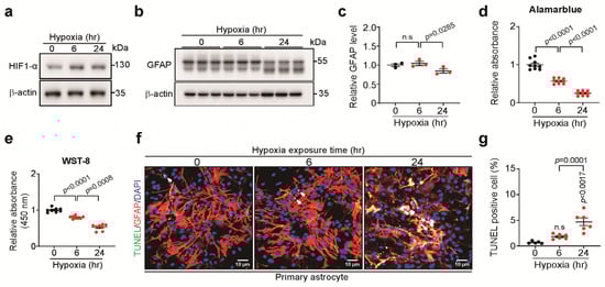 To confirm the effect of long-term hypoxia on astrocytes, primary astrocytes were exposed to 6 and 24 h (h) of hypoxia (37 °C, 94% N2, 5% CO2, 1% O2). Adaptive response to long-term hypoxia was confirmed by HIF-1α expression (Figure 1a). Glial fibrillary acidic protein (GFAP) expression was significantly reduced when hypoxic exposure was prolonged up to 24 h (Figure 1b,c). Astrocyte viability decreased (Figure 1d,e), and cellular apoptosis increased in a time-dependent manner (Figure 1f,g). These results indicate that long-term hypoxia has deleterious effects on astrocytes.