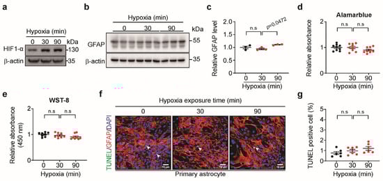 The effect of short-term hypoxia on astrocyte activation and viability. (a) Representative Western blot images of HIF-1α in astrocytes under short-term hypoxia. (b) Representative Western blot images of GFAP in astrocytes under short-term hypoxia. (c) Quantification of GFAP levels shown in (b) (n = 3). (d) AlamarBlue assay (n = 9). (e) WST-8 assay (n = 8). (f) Representative images of TUNEL (green, arrowhead) staining in astrocytes under short-term hypoxia. DAPI (blue) was used for nuclei staining (scale bar, 10 μm). (g) Quantification of (f) as the ratio of TUNEL positive to DAPI. Bars represent the mean ± S.E.M. One-way ANOVA followed by Tukey’s post hoc test (n = 6). n.s, not significant.