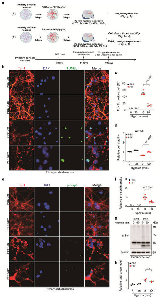 The effect of hypoxia on neurons. (a) A schematic summary of the experimental design. (b) Representative images of TUNEL (green) and Tuj-1 (red) staining in neurons under 90 min of hypoxia. DAPI (blue) was used for nuclei staining (scale bar, 10 μm). (c) Quantification of (b) as the ratio of TUNEL positive to DAPI. Bars represent the mean ± S.E.M. An unpaired t-test (n = 4). (d) WST-8 assay (n = 5). An unpaired t-test. (e) Representative images of p-α-syn (green) and Tuj-1 (red) staining in neurons under 90 min of hypoxia. DAPI (blue) was used for nuclei staining (scale bar, 10 μm). (f) Quantification of p-α-syn (n = 5). Bars represent the mean ± S.E.M. An unpaired t-test. (g) Representative Western blot images of α-syn in PFF-treated neurons under 90 min of hypoxia. (h) Quantification of α-syn levels shown in (g) (n = 3). Bars represent the mean ± S.E.M. An unpaired t-test. N.D, not detected; n.s, not significant.