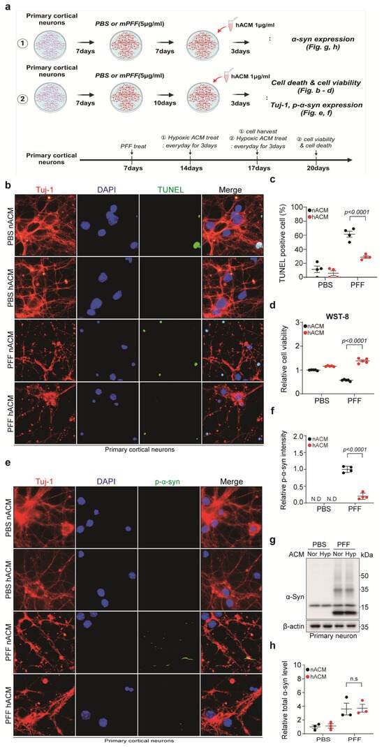 To confirm the neuro-protective effect of hypoxia-induced activated astrocytes, primary cortical neurons were treated with PFF 7 days after neuronal culture, and 90 min of hACM was administered for 3 days at 7 and 10 days after PFF treatment (Figure 4a). The administration of hACM significantly reduced neuronal apoptosis and increased the viability of PFF-treated neurons (Figure 4b–d). Furthermore, hACM significantly reduced p-α-syn expression in PFF-treated neurons (Figure 4e,f). Total α-syn expression did not significantly differ between PFF-treated neurons with normoxia-exposed ACM and hACM (Figure 4g,h). These results imply that hACM exerts a protective effect on PFF-treated neurons.