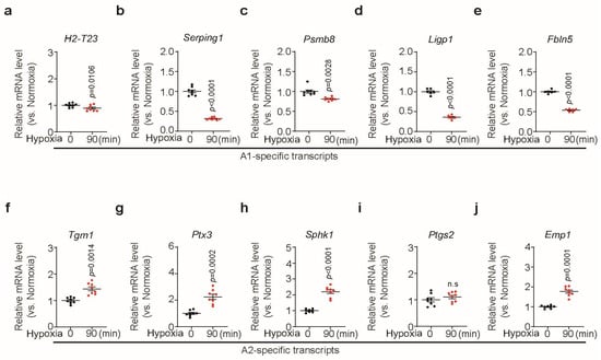 When astrocytes were exposed to 90 min of hypoxia, A1-specific mRNA levels significantly decreased (Figure 5a–e), whereas A2-specific mRNA levels significantly increased (Figure 5f–j). These results indicate that protective A2 astrocytes were activated, whereas toxic A1 astrocytes were suppressed in response to short-term hypoxia. The raw data of qPCR are separately described in Table S2.