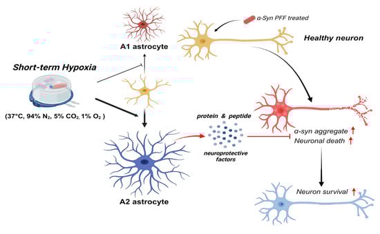The major finding of this study was that short-term hACM treatment rescued PFF-induced neuronal death. Mechanistically, short-term hypoxia reduces toxic p-α-syn expression by activating protective A2 astrocytes.
