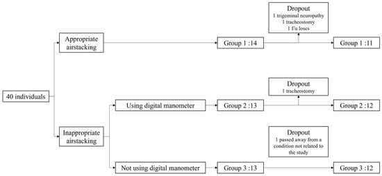 The patients were stratified into three groups: 14 in Group 1, 13 in Group 2, and 13 in Group 3. Among them, 11 patients in Group 1 and 12 patients in each of Groups 2 and 3 completed the study, resulting in a final cohort of 35 participants. The reasons for dropout included the following: in Group 1, three participants were excluded—one due to trigeminal neuralgia preventing airstacking, one due to undergoing tracheostomy, and the other due to follow-up loss. In Group 2, one participant dropped out due to a tracheostomy. In Group 3, one participant was excluded due to passing away from a condition not related to the study (Figure 1).
