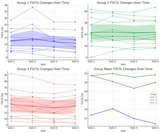 The mean FVC% values and standard deviations for each group at baseline (Visit 1) and at 12 months (Visit 4) are summarized as follows: Group 1 showed a decrease from 12.69 ± 7.94% at baseline to 10.77 ± 7.93% at 12 months. In contrast, Group 2 remained relatively stable, with values of 21.95 ± 12.81% and 22.37 ± 11.64% at baseline and 12 months, respectively. Similarly, Group 3 showed minimal change, decreasing slightly from 21.95 ± 11.50% to 20.69 ± 10.64% (Figure 2 and Table 1).
