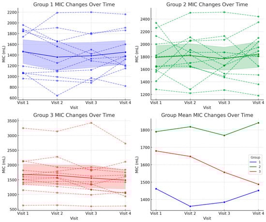 For MIC, Group 1 showed a decrease in MIC from 1461.82 ± 399.55 mL at baseline to 1451.82 ± 393.26 mL at Visit 4. Group 2, on the other hand, remained relatively stable, with MIC values of 1790.00 ± 333.52 mL at baseline and 1840.83 ± 375.99 mL at 12 months. Group 3 showed minimal change, decreasing slightly from 1679.17 ± 640.99 mL to 1487.50 ± 587.17 mL (Figure 3 and Table 2).