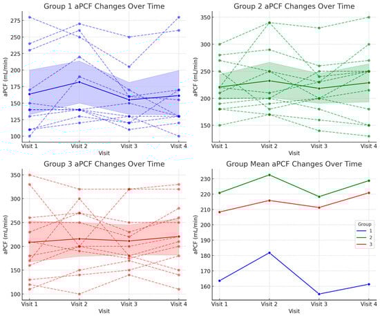 For aPCF, Group 1 showed a decrease in aPCF from 1461.82 ± 399.55 mL/min at baseline to 1451.82 ± 393.26 mL/min at Visit 4. Group 2, on the other hand, remained relatively stable, with aPCF values of 1790.00 ± 333.52 mL/min at baseline and 1840.83 ± 375.99 mL/min at 12 months. Group 3 showed minimal change, decreasing slightly from 1679.17 ± 640.9 mL/min 9 at baseline to 1487.50 ± 587.17 mL/min at Visit 4 (Figure 4 and Table 3).