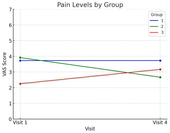 The changes in musculoskeletal pain were evaluated using a VAS at baseline (Visit 1) and the follow-up (Visit 4). Group 1 showed no significant change in pain levels, maintaining a mean score of 3.73 ± 2.94 across both time points, and Group 3 showed a slight increase in pain levels from 2.25 ± 3.08 at Visit 1 to 3.17 ± 2.66 at Visit 4. In contrast, Group 2 exhibited a reduction in pain levels, with the scores decreasing from 3.92 ± 3.15 at Visit 1 to 2.67 ± 2.67. The repeated measures ANOVA revealed a significant interaction effect between group and time (p = 0.045), indicating that the trajectory of pain levels differed among the groups. Post hoc analyses confirmed that the pain reduction observed in Group 2 was significantly greater than in Group 3 (p = 0.036), while no significant difference was observed between Groups 1 and 2 or Groups 1 and 3 (p > 0.05) (Figure 5).