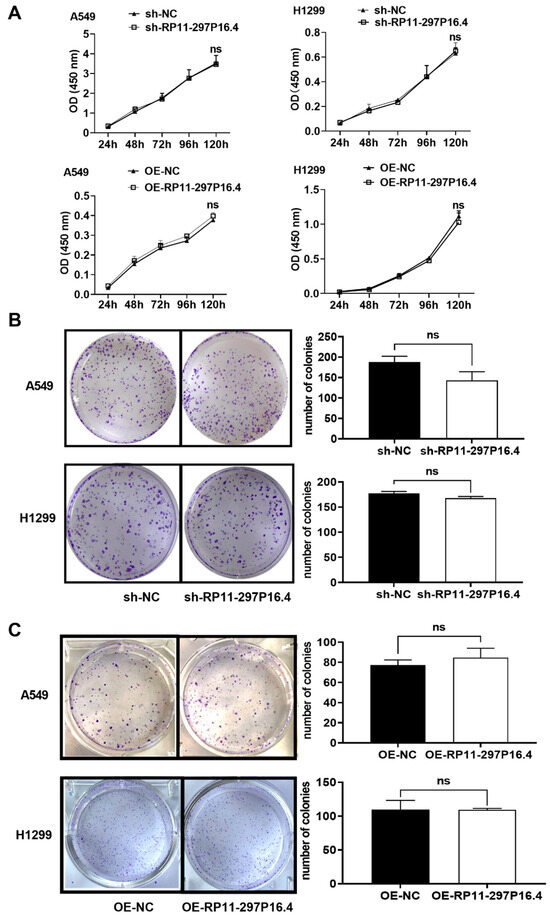 CCK-8 and colony formation assays were performed to determine the effects of knocking down and overexpressing lncRNA RP11-297P16.4 on the growth of A549 and H1299 cells. (A) CCK-8 assay of growth ability following the transfection of sh-RP11-297P16.4 (RP11-297P16.4-knockdown) or OE-RP11-297P16.4 (RP11-297P16.4-overexpressing) in A549 and H1299 cells. (B) Colony formation assay of the growth ability of these cells following sh-RP11-297P16.4 transfection. (C) Colony formation assay of the growth ability of A549 and H1299 cells following OE-RP11-297P16.4 transfection. Data are presented as mean ± SD. Abbreviations: ns, no significant difference vs. NC group.