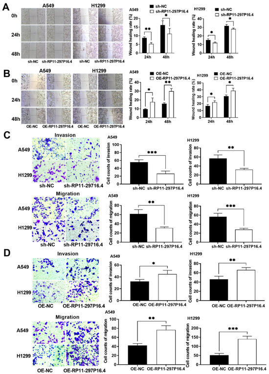Wound healing and transwell assays were conducted to determine metastasis in A549 and H1299 cells in which lncRNA RP11-297P16.4 was knocked down or overexpressed. Wound healing assays were conducted to determine the metastatic ability following sh-RP11-297P16.4 transfection (A) and OE-RP11-297P16.4 transfection (B) in A549 and H1299 cells. Transwell assays were performed to determine the invasion and migration abilities following sh-RP11-297P16.4 transfection (C) and OE-RP11-297P16.4 transfection (D) in A549 and H1299 cells. Data are presented as mean ± SD; * p < 0.05, ** p < 0.01, and *** p < 0.001.