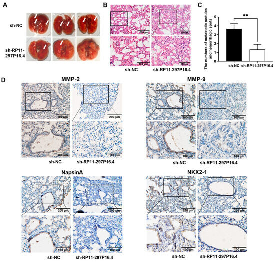 Knockdown of lncRNA RP11-297P16.4 suppressed xenograft tumor metastasis. (A) Representative images showing hemorrhagic spots and metastatic nodules (white arrows) in mouse lungs inoculated with sh-RP11-297P16.4- or sh-NC-transfected A549 cells. (B) H&E staining for morphological alterations in the tumor metastasis of the sh-RP11-297P16.4 and sh-NC groups. (C) Tumor numbers and hemorrhagic spots on the mouse lung surface were compared between the sh-RP11-297P16.4 and sh-NC groups. (D) NKX2-1, Napsin A, MMP-2, and MMP-9 immunoreactivities in mouse lung tissues from the sh-RP11-297P16.4 and sh-NC groups. Data are presented as mean ± SD; ** p < 0.01.