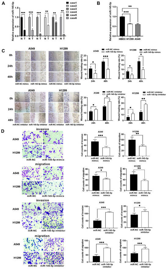 MiR-145-5p exerted an antioncogenic effect on NSCLC. (A) MiR-145-5p levels in six paired LUAD tissues and matched non-carcinoma samples were determined by RT-qPCR assays. (B) MiR-145-5p expression in A549 H1299 cells and HBECs was analyzed via RT-qPCR. (C) Metastatic ability of A549 and H1299 cells after miR-145-5p knockdown or overexpression was determined by conducting wound healing assays. (D) Metastatic ability of A549 and H1299 cells after miR-145-5p knockdown or overexpression was determined by conducting transwell assays. Data are presented as the mean ± SD; * p < 0.05, ** p < 0.01, and *** p < 0.001.